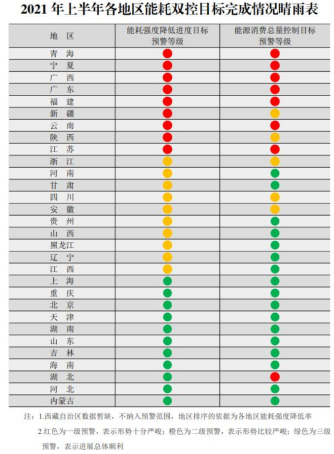 而8月12日国家发改委发布《2021年上半年各地区能耗双控目标完成情况晴雨表》,其中显示: