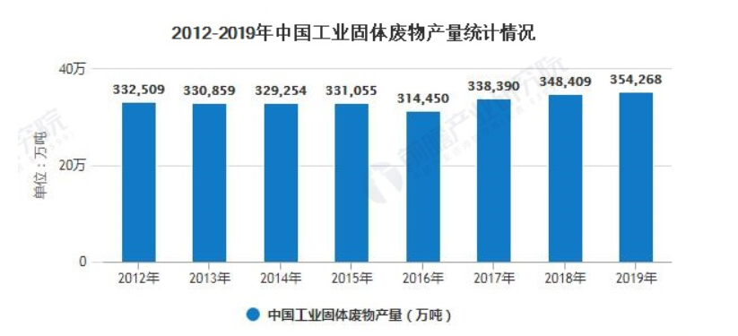 工业固体废物是工业生产过程中排入环境的各种废渣、粉尘及其他废物。可分为一般工业废物(如高炉渣、钢渣、赤泥、有色金属渣、粉煤灰、煤渣、硫酸渣、废石膏、脱硫灰、电石渣、盐泥等)和即危险固体废物。从下图表数据可以看出,2012-2019年,我国工业固废产生量呈波动变化,2012-2016年产生量波动下滑,2017年以后产生量小幅增长。初步测算2019年,全国工业固体废物产生量35.43亿吨,比上年增加1.68%。