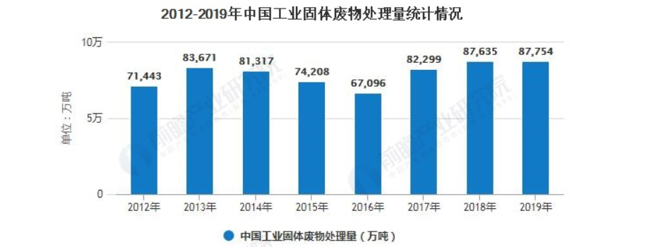 根据《大宗工业固体废物综合利用规划》,指出2010-2015年,大宗工业固体废物产生量也随之增加,处理量不断增加,“十三五”时期受绿色经济发展的影响工业固体废物的处理能力进一步上升。处理量从2015年的74208万吨增加至2019年的87754万吨,尾矿、有色冶炼废物处理是重点。据相关资料统计2015年工业固体废物处理市场产值约为5000亿,按照675元/吨的处理产值,测算2019年我国工业固体废物的处理规模约为5923亿元。